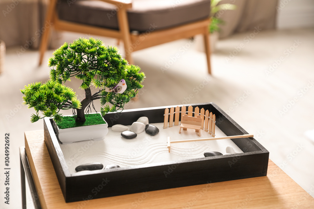 Acrylic Prints Beautiful Miniature Zen Garden On Wooden Table